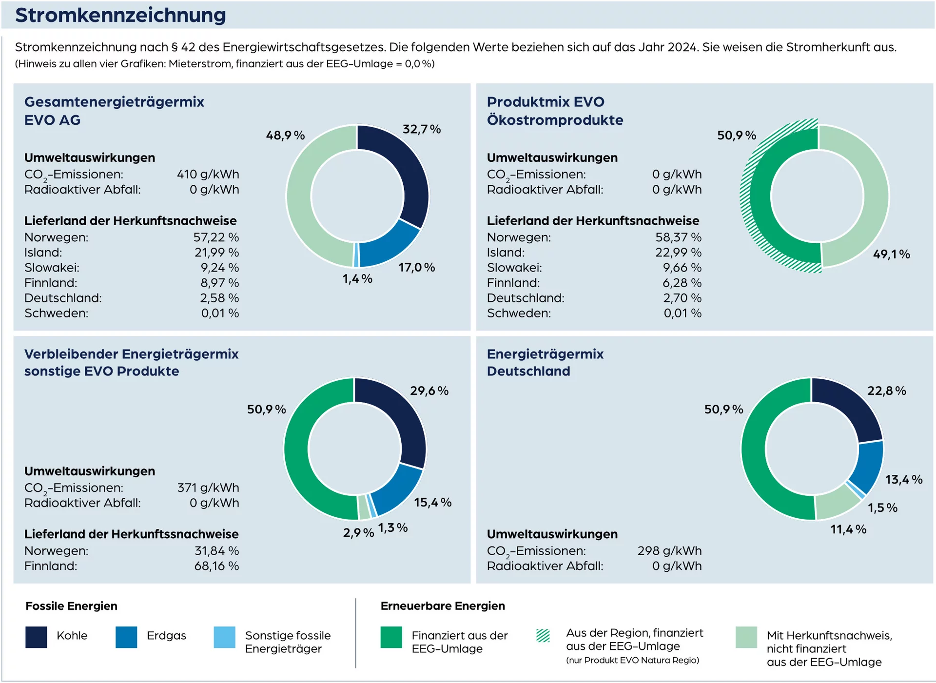 Sie finden hier die Zusammensetzung des Stroms, den die EVO AG im Jahr 2024 an ihre Letztverbraucher geliefert hat (Gesamtenergieträgermix gemäß § 42 EnWG ohne den Anteil Erneuerbare Energien, finanziert aus der EEG-Umlage)¹. Für unsere Kunden mit den Ökostromprodukten gilt unser spezifischer Produktmix für EVO Ökostromprodukte². Für unsere Kunden, die ein anderes Stromprodukt beziehen, gilt der verbleibende Energieträgermix für sonstige EVO Produkte³. Der durchschnittliche Energieträgermix für Deutschland⁴ dient jeweils zum Vergleich.