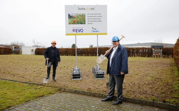 Entstanden ist die Blühwiese in Kooperation von EVO und Naturschutzbund (NABU). Eine Fachfirma hatte die Fläche zunächst umgegraben und für die Aussaat vorbereitet. Dann wurde eine Bio-Saatmischung verteilt. Schon im nächsten Frühling werden dort zahlreiche heimische Wildpflanzen blühen – dazu zählen Königskerzen, Glockenblumen, Moschus-Malven oder auch die Wiesen-Margerite.