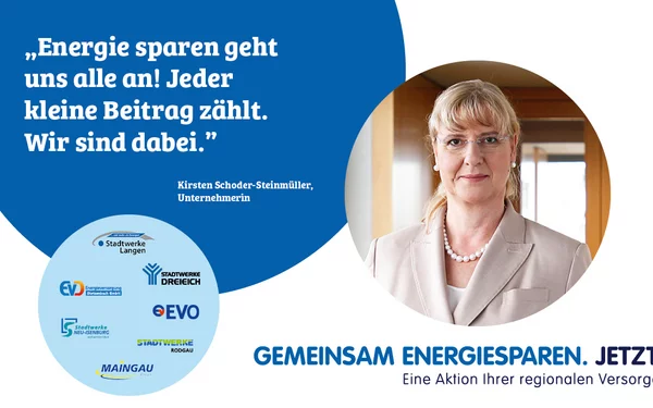 STADT UND KREIS OFFENBACH, 15. Juli 2022. Mit einer gemeinsamen Werbeaktion rufen die Versorger in Stadt und Kreis Offenbach alle Verbraucher zum Energiesparen auf. Sie reagieren damit auf die stark gedrosselten Erdgas-Lieferungen aus Russland. An der Initiative der Energieversorgung Offenbach AG (EVO) beteiligen sich die MAINGAU Energie aus Obertshausen sowie die Energieversorgung Dietzenbach und die Stadtwerke Dreieich, Langen, Neu-Isenburg und Rodgau.