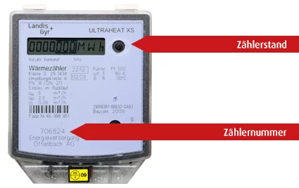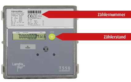 1x kurz den schwarzen Knopf rechts neben Display drücken > Anzeige aktueller Zählerstand in MWh mit eingerahmten Nachkommastellen. Zählernummer ist unterhalb des Barcodes ersichtlich.