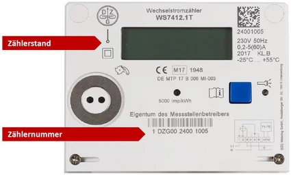 Die abzulesenden Zählerstände werden bei Eintarif unter 1.8.0 in kWh und bei Doppeltarif unter 1.8.1 (HT) und 1.8.2 (NT) in kWh angezeigt. Zählernummer ist über dem Barcode ersichtlich.