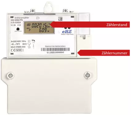 Der abzulesende Zählerstand wird unter 2.8.0 (Lieferung) in kWh angezeigt. Die Zählernummer ist unter dem Barcode ersichtlich.