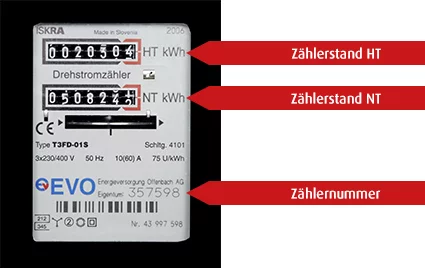 Die abzulesenden Zählerstände werden unter 1.8.0, 2.8.0, 1.8.1 (HT) und 1.8.2 (NT) in kWh angezeigt. Die Zählernummer ist unter dem Barcode ersichtlich.