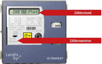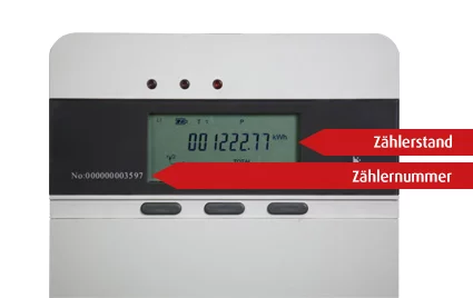 1x kurz den rechten gelben Knopf neben Display drücken > Anzeige aktueller Zählerstand in MWh mit eingerahmten Nachkommastellen. Zählernummer ist unterhalb des Barcodes ersichtlich.