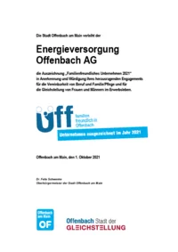 Zertifikat der Stadt Offenbach für unser Engagement für die Vereinbarkeit von Beruf & Familie und für die Gleichstellung von Frauen und Männern im Erwerbsleben.